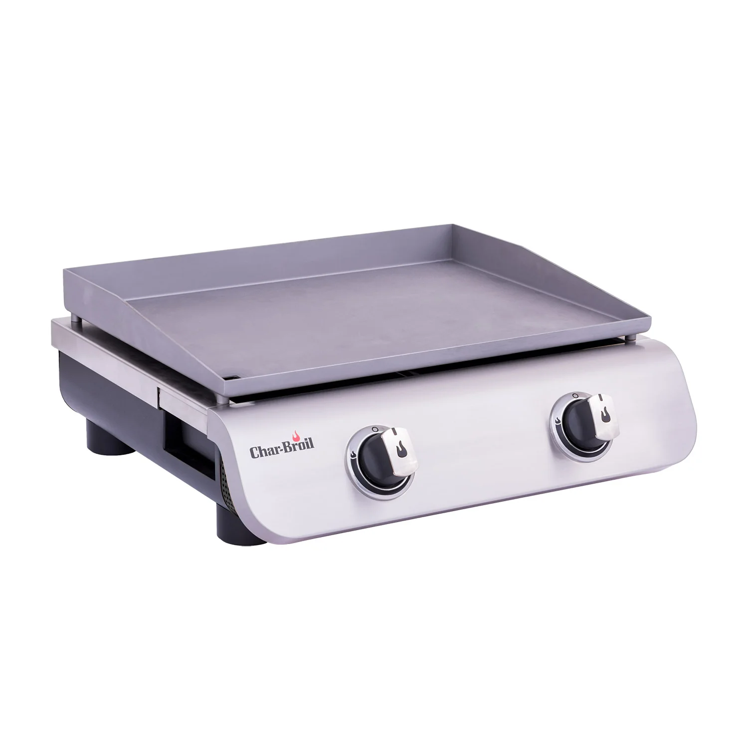 Enjoy grilled food anywhere at anytime with the Charbroil® 2-Burner Tabletop Griddle. It’s equipped with two burners for zonal cooking that allows you to grill food on each side of the griddle at different temperatures. The compact size and integrated handles make it easy to pack-up and go, while adjustable legs let you grill-it-up despite uneven surfaces. The side grease-cup securely locks in place, making travel and clean-up easier than ever before.