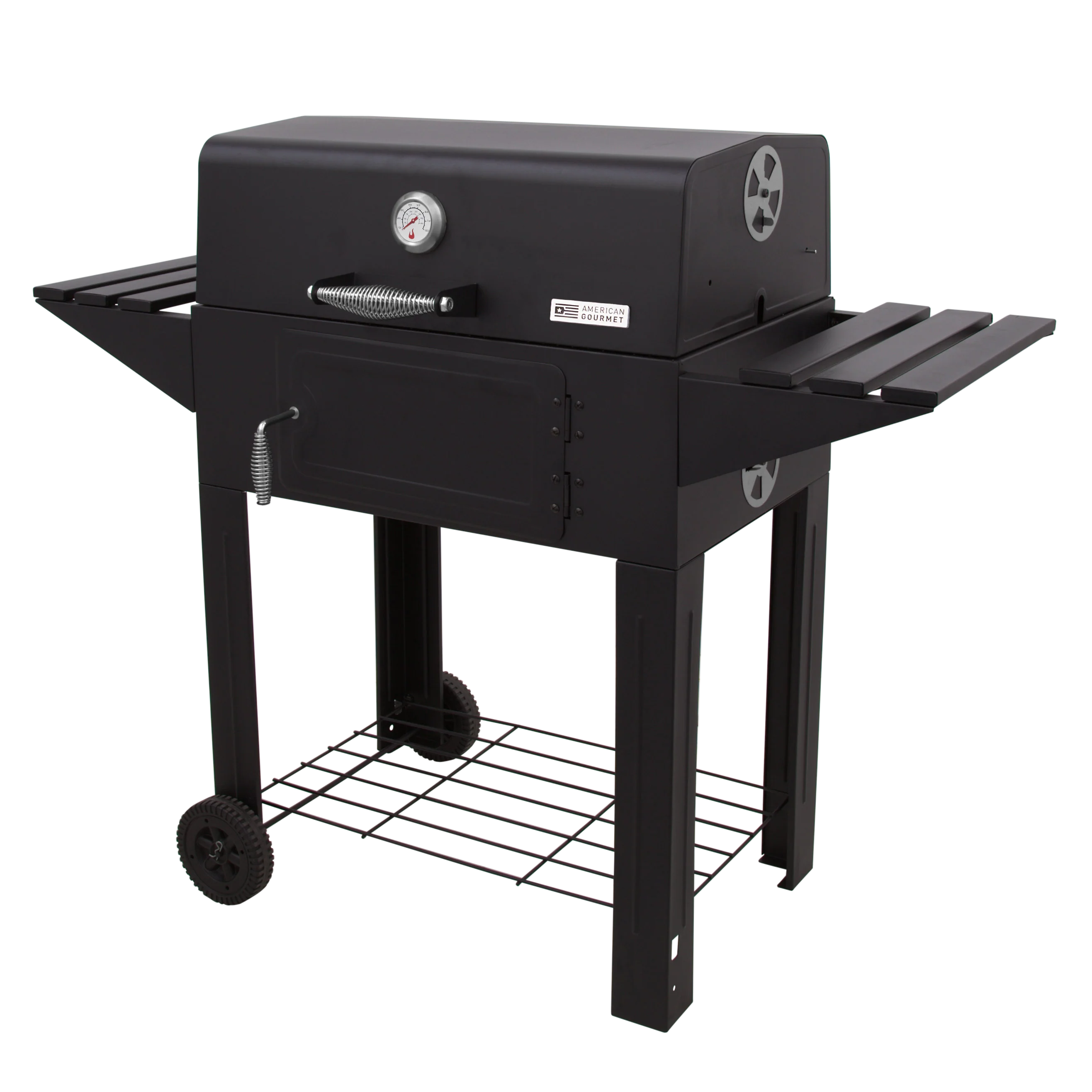 The American Gourmet® 615 Charcoal Grill by Char-Broil® is a mid-size box-style grill with 615-square-inches of grilling space. Enjoy uninterrupted grilling, conveniently tending the fire through the charcoal access door while multiple dampers and a height-adjustable charcoal pan allow for easy control of heat and smoke. Use the warming rack to keep food warm or cook at lower temperatures and the side shelves to prep your food and hold your tools.