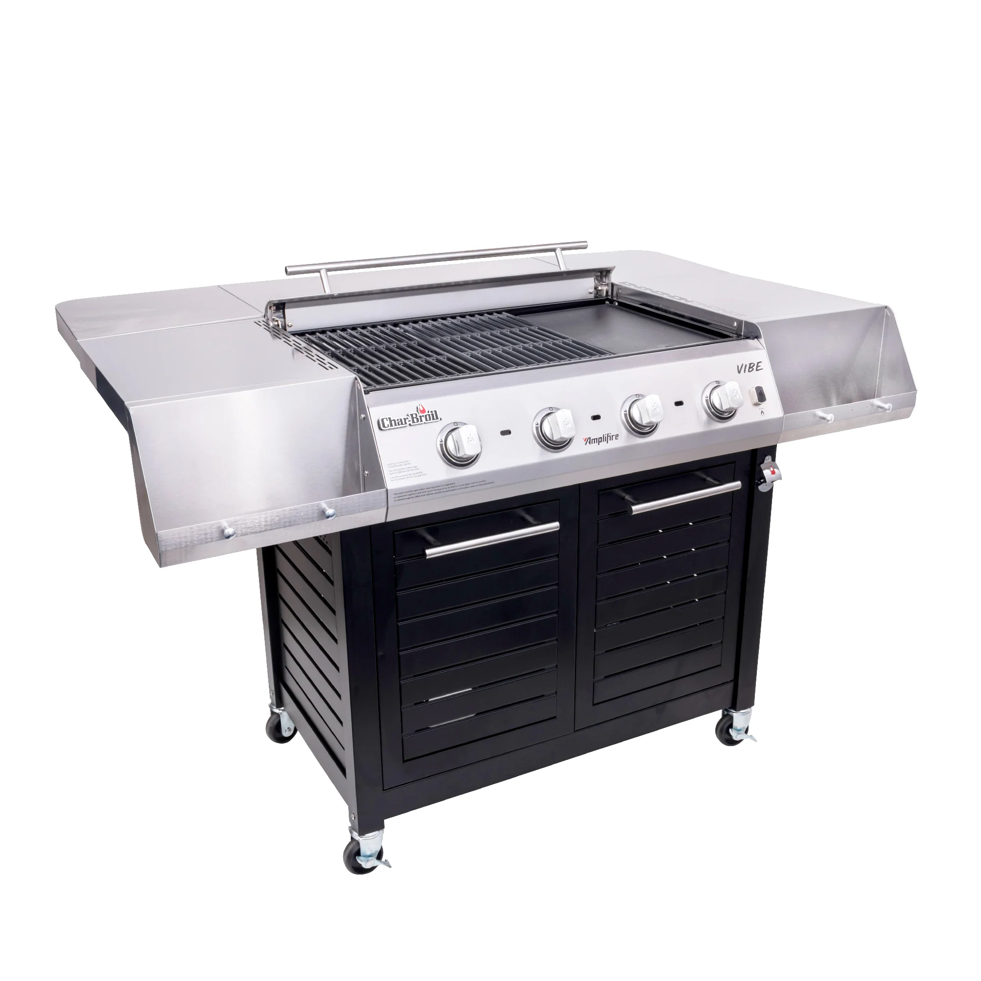 Make memories with friends and family gathered around the Char-Broil® Vibe™ 535 Gas Grill - Griddle. Equipped with a hideaway lid and an expansive folding back shelf, we included a griddle surface to give you the versatility to grill breakfast, lunch and dinner. This innovative 4-burner grill transforms your cookouts making you the star of your backyard barbecue. Whether you’re serving it up hibachi style, teaching the kids to grill or flipping burgers with your friends, you’re always at the center of the cookout action. Our Amplifire™ cooking system delivers superior performance for juicier, flavor-packed food with no guesswork, maintaining even heat while you enjoy open-lid grilling on 535-square-inches of total cooking space. This grill is easy to assemble and equipped with electronic ignition to make it easy to start. Side shelves have large built-in condiment baskets with Gear Trax™ Tool Hooks on the front to give you a more organized workspace.
