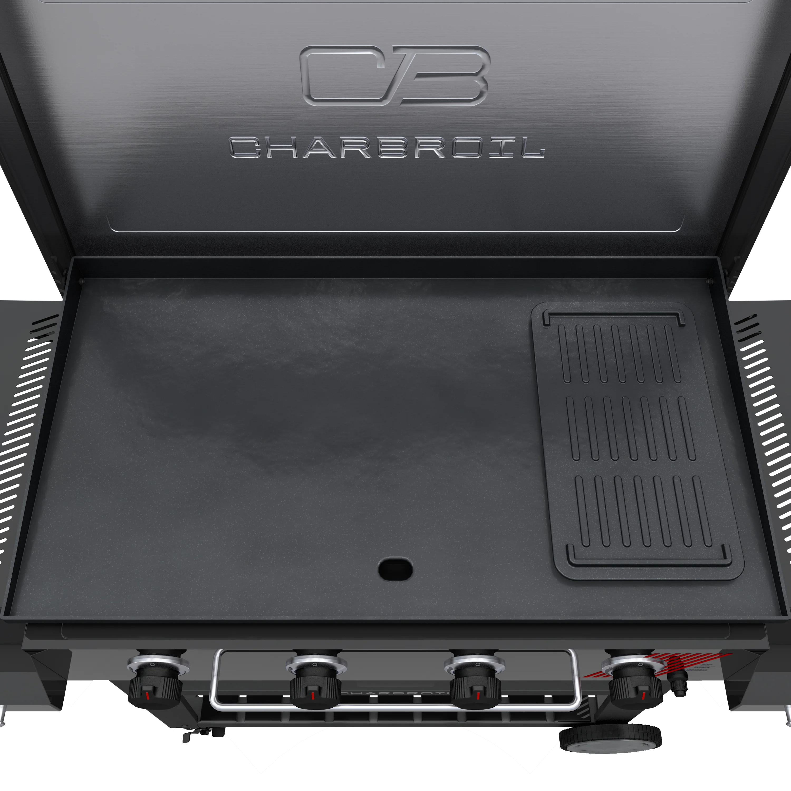 The Charbroil® 36" Performance Series™ Deluxe 4 Burner Gas Griddle with Cart is for anyone serious about griddling! Whether it's breakfast, lunch, or dinner our patent pending sear zone and TRU-Zonal cooking technology will help you up your game. Start the day with light and fluffy pancakes while simultaneously cooking crispy, crackling bacon in the independent cooking zones. Frozen hash browns? No worries, there's no warping here. The cooktop was designed for optimal performance with fresh and frozen foods. When lunchtime rolls around, the built-in wind blockers will efficiently help you battle any unexpected wind to conserve fuel while maintaining high and even temps for smash burgers or tacos. Use the hinged cooking lid to melt cheese or steam veggies. Later, reach searing temperatures over 700°F for steakhouse-quality results every time.