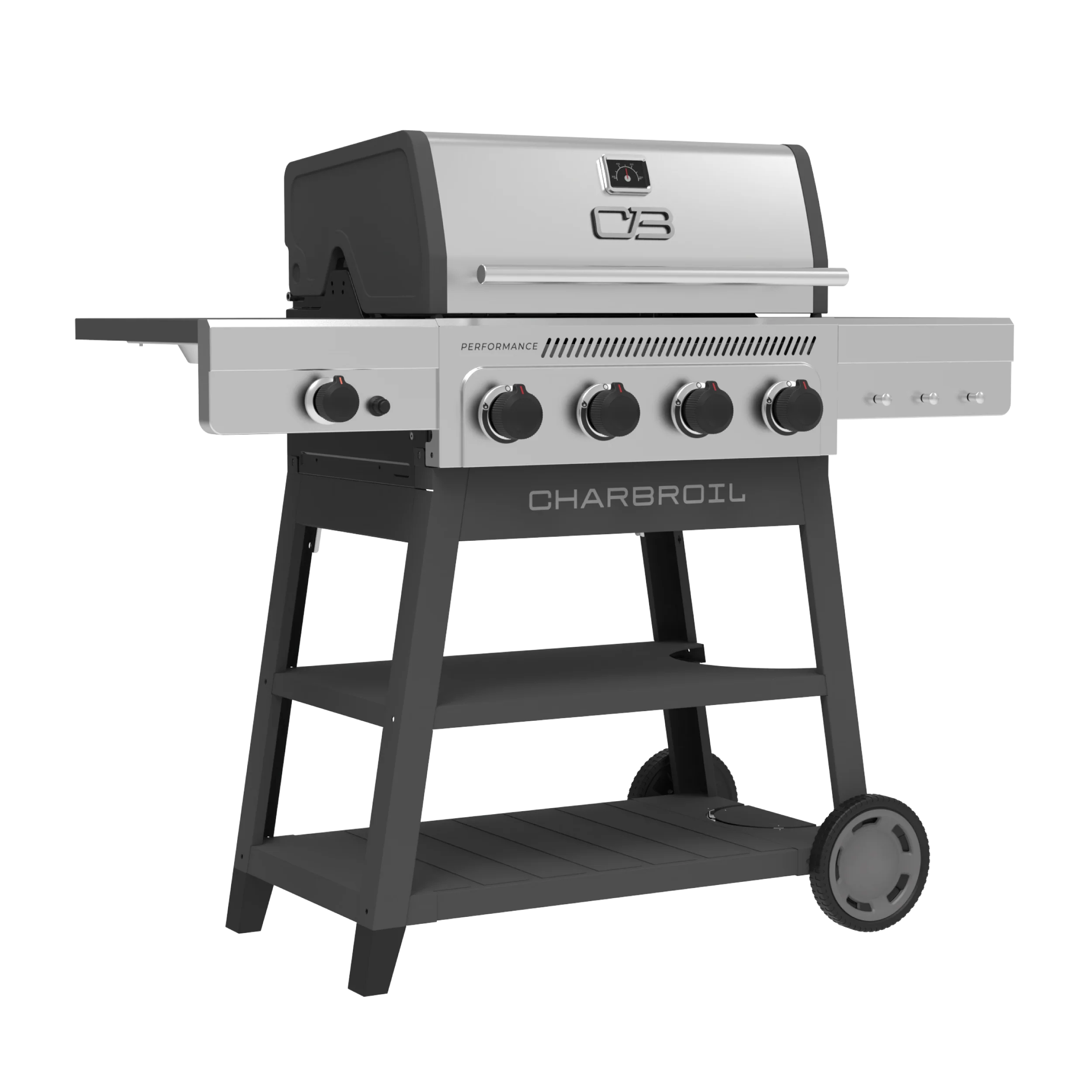 A grill that looks sharp and cooks even sharper. The Charbroil® Performance Series™ 4-Burner Cart Gas Grill with Side Burner in gray stainless is built for hosts who love variety without hassle. Fire it up for consistent heat, fewer flare-ups, and flavorful food every time. With 435 sq. in. of primary space and a swing-away warming rack, you’ll handle mains and sides like a pro. The side burner brings flexibility for sauces or skillet dishes, while Gear Trax® shelves and tool hooks keep everything organized, so you focus on friends, not stress.
