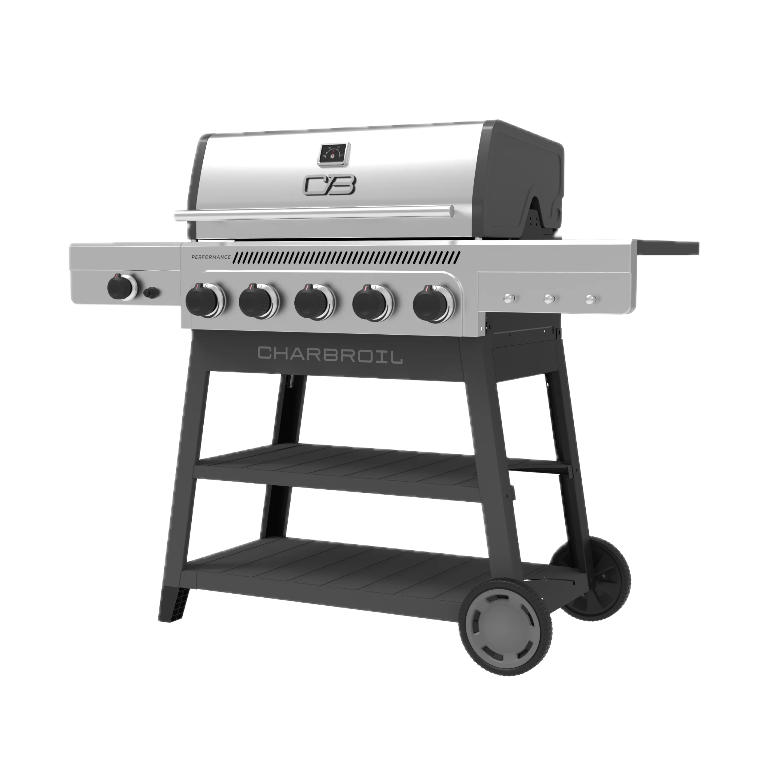 Cook with confidence and style on the Charbroil® Performance Series™ 5-Burner Cart Grill in stainless steel. With 490 sq. in. of primary space, it easily handles 28 burgers at once while FlavorMax™ technology guarantees consistent heat and juicier results. An 11,000 BTU side burner lets you prep sauces or sides as your mains cook. Porcelain-coated grates simplify cleanup, and Gear Trax® shelves keep tools within reach. Heavy-duty wheels make it easy to move, so wherever your friends gather, this grill keeps you at the center of it.